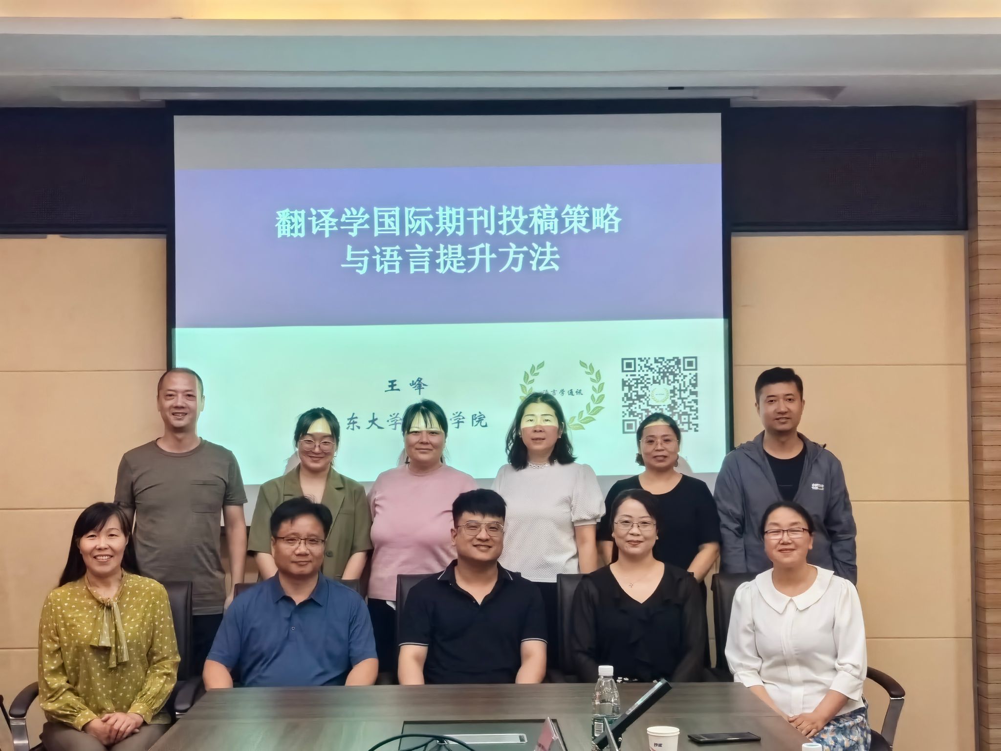 师生的科研成果走向国际。王峰从刊物选择出发,介绍了翻译学领域的15本国际核心刊物。他指出,在阅读刊物时一定要先读Aims and scope, Journal information, Submission guidelines这些信息,去发现期刊的学术品位、发文偏好、发文范围、专刊征稿、稿件字数以及稿件格式等。其次,王峰指出产出一篇高质量论文的前提是要学会模仿,老师们可以遵循确立选题、寻找文献、提炼思想、模仿语言、二轮文献搜索、打磨语言这6个步骤,先模仿后创造。再次,王峰结合案例分析如何借助语步结构撰写英文摘要。最后,王峰提出了几点宝贵的建议:一是学会用新方法研究老话题;二是无论研究那个领域,都要先看该领域的国际专著,后看国际文献,在此过程中要积累好词好句,学习学术语言表达,要将行话的积累贯穿学术研究的整个过程;三是要先读后写,先模仿后创造,先积累后产出,对于初级学习者,语言和研究都要模仿。