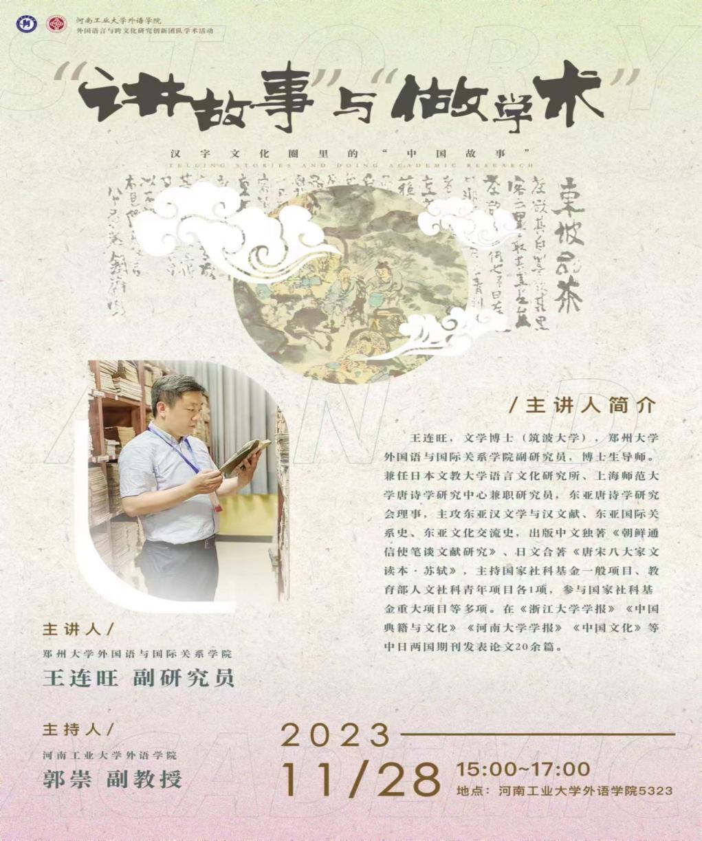 2023年11月28日下午,星空体育 外国语言与跨文化研究团队和非通用语与跨文化研究团队特邀郑州大学外国语星空体育 副研究员、博士生导师王连旺老师以“讲故事”与“做学术”:汉字文化圈里的“中国故事”为题做专题讲座,多语种教研室老师以及部分英语老师、研究生同学参加了此次讲座,讲座由郭崇老师主持。