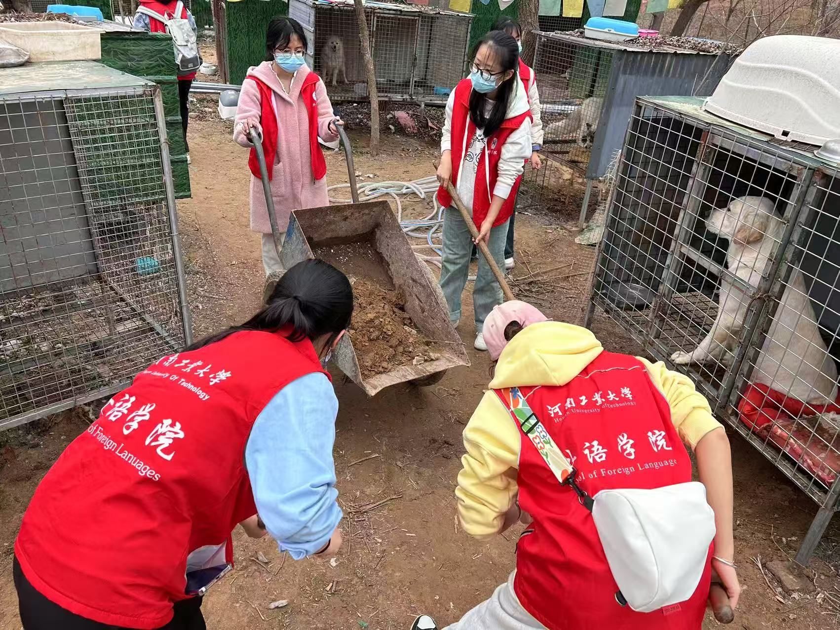 活动现场,志愿者们身着红色马甲,分工协作投入服务:有的清理杂草和树枝,有的打扫铁笼内外的卫生,还有的协助工作人员对小动物进行日常护理;部分英语专业学生发挥特长,为基地设计双语领养宣传手册。此外,同学们还亲手制作了“爱心认养牌”,标注每只动物的名字与性格特点,让它们感受到更多“被看见”的温暖。经过大家的共同努力,小动物保护中心的环境得到了显著改善,小动物们的生活质量也得到了提升。