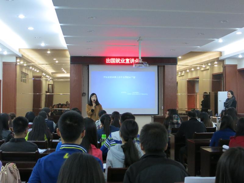 接着,河南省新梦想大学生出国就业工程的负责老师介绍了出国就业项目,此项目是由河南省教育厅和中国国际贸易促进委员会河南省委员会主办。运营一年来,共有300余名同学成功应聘卡塔尔航空公司、法国老佛爷百货公司等世界500强企业。