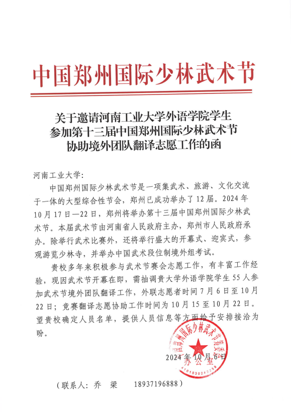 2024年10月17日至22日,第十三届郑州国际少林武术节暨中国郑州国际少林武术大赛在郑州举行。为了使广大外国朋友深入了解中国传统文化和赛事活动,帮助境外参赛团队和运动员顺利参与比赛,受郑州市体育局和第十三届郑州国际少林武术节筹委会邀请,外国语星空体育