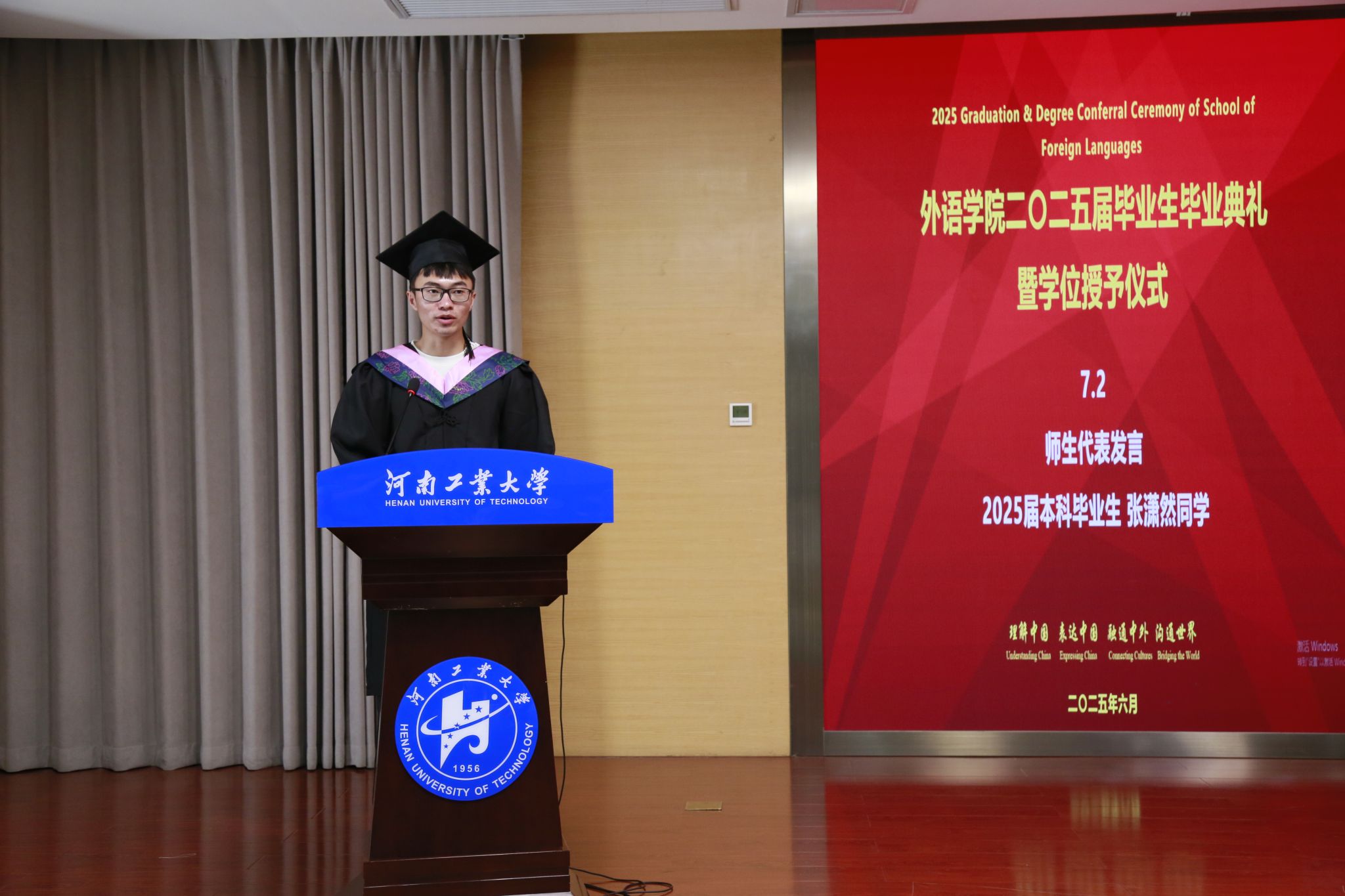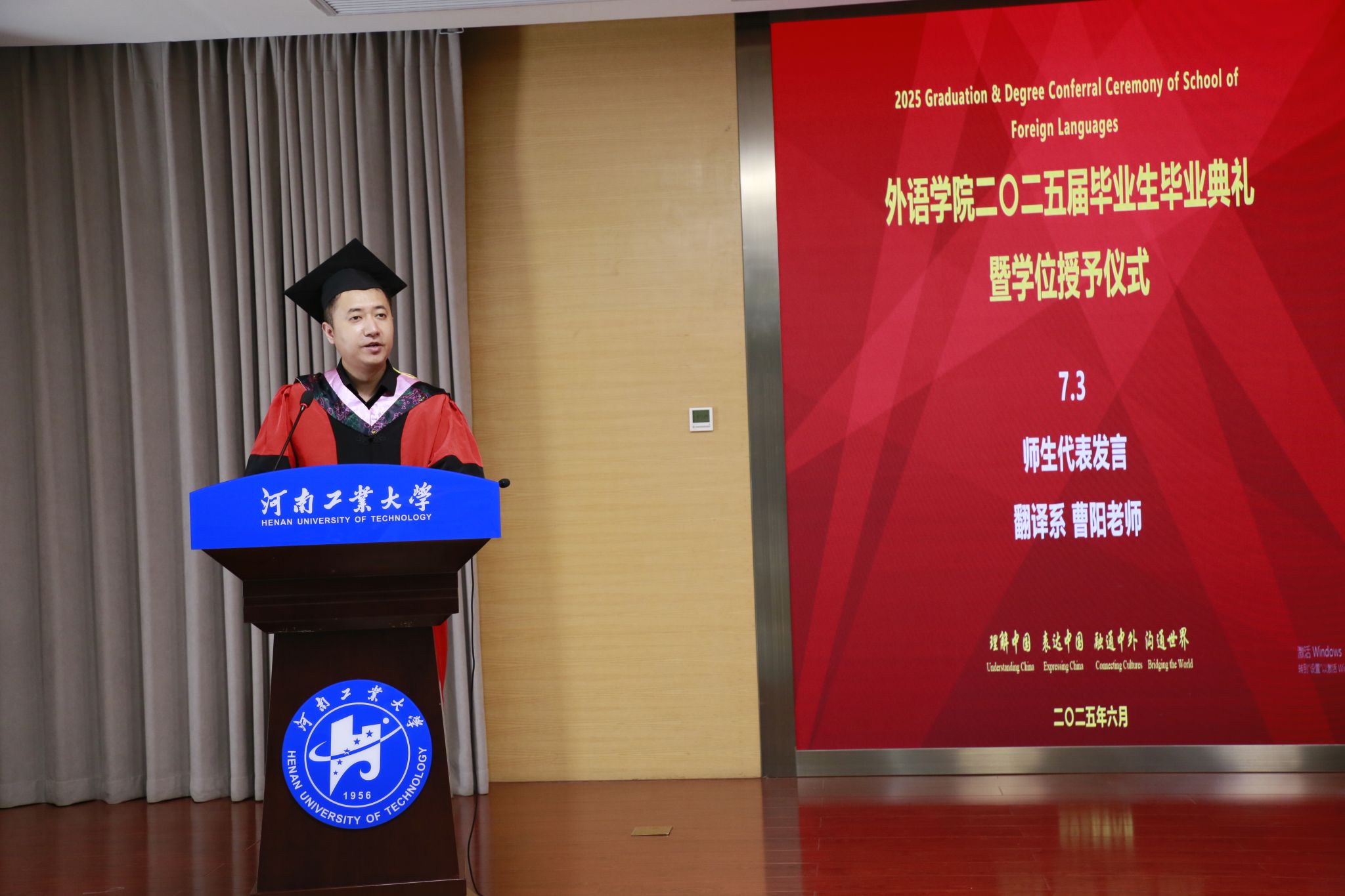 毕业不是终点,而是新征程的起点。教师代表曹阳老师用“信、达、雅”三原则,来总结往昔,寄语来日。同时希望同学们自信地拥抱自己、勇敢地拥抱时代、开放地拥抱世界,在人生的坐标系中书写属于自己的壮丽篇章。