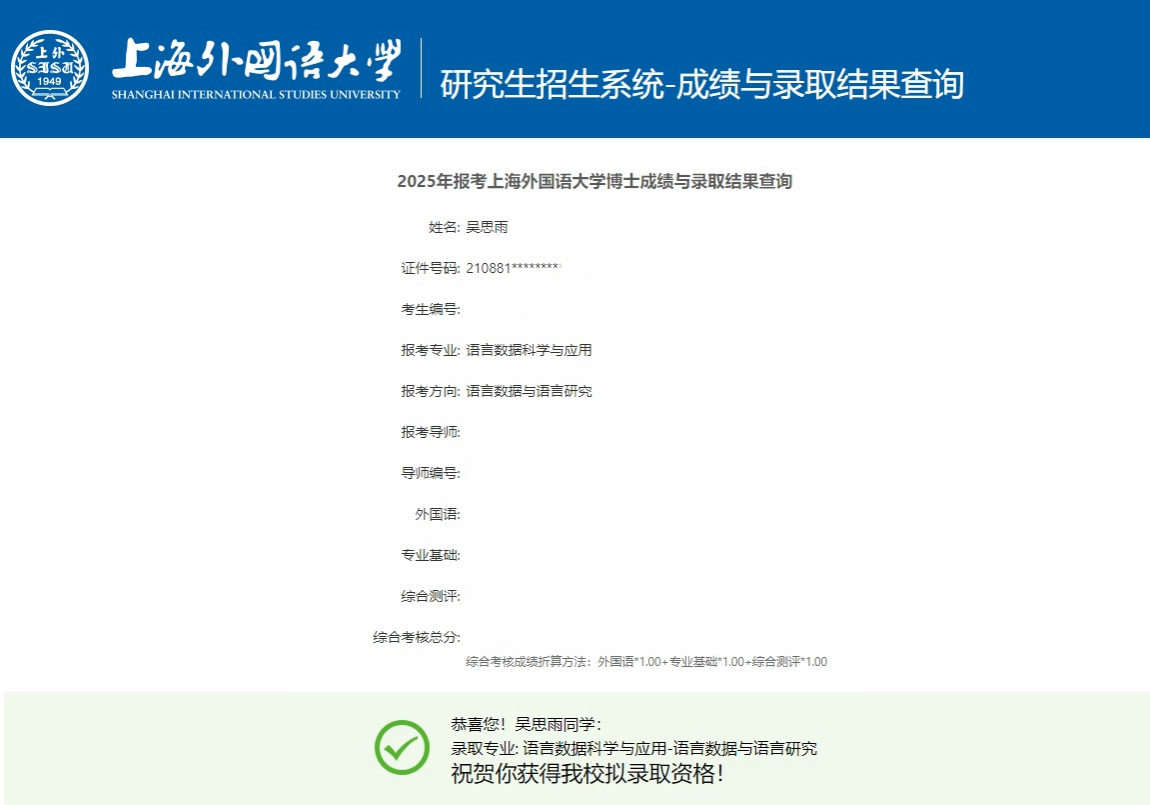 2025届硕士研究生吴思雨同学成功考取上海外国语大学语言科学研究院,语言数据科学与应用专业博士研究生,彰显星空体育