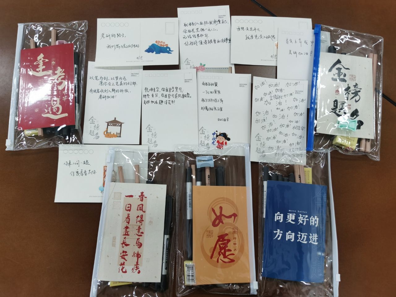 精心准备的考研文具套装,以及2023级本科生写满美好准圆的精美卡片。