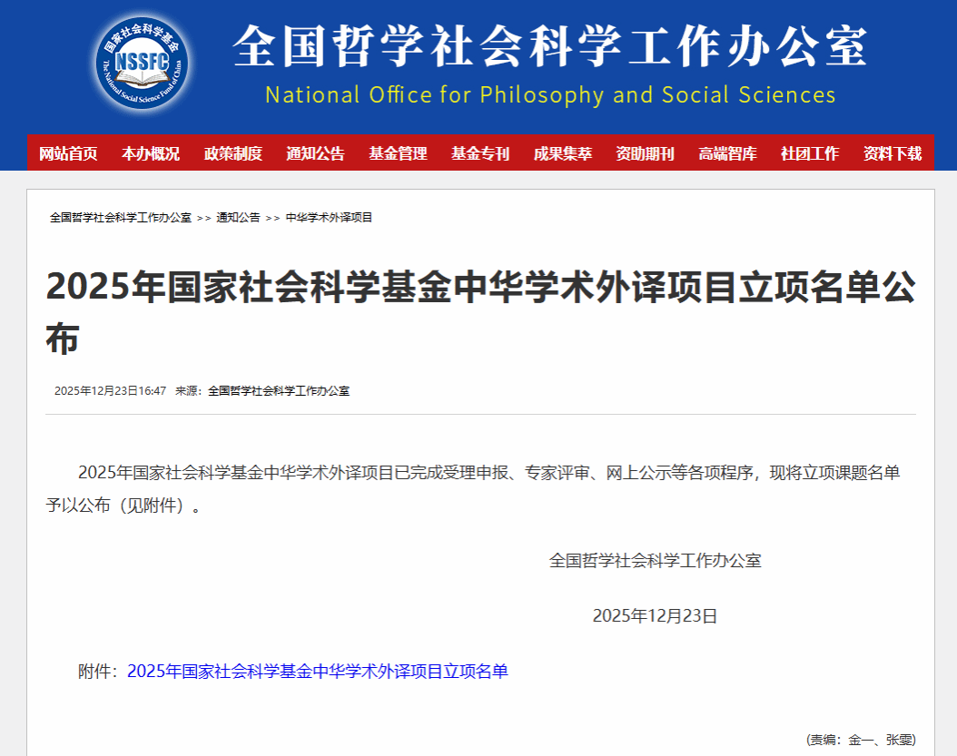 近日,全国哲学社会科学工作办公室公布了2025年国家社会科学基金中华学术外译项目立项名单。星空体育