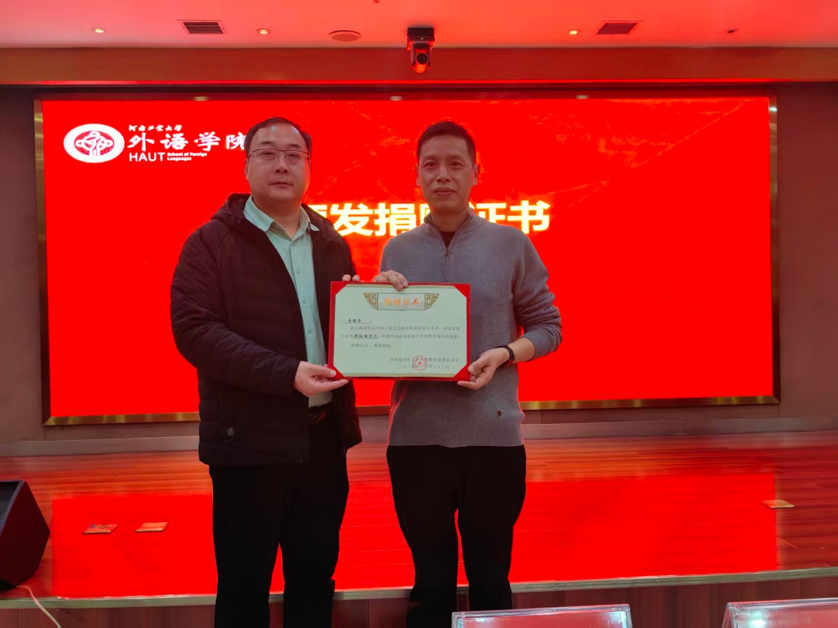 马武刚主任向平锦华颁发捐赠证书
