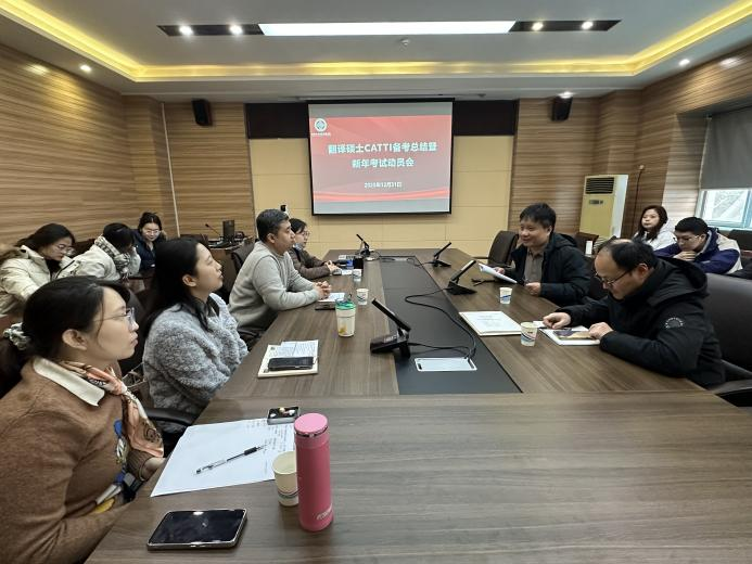 于5231会议室召开CATTI备考总结暨新年考试动员会。沈国荣副院长,孟令维、赵炜、邰肇丹、张楚一、曹阳等5位教师及2025级全体翻译硕士研究生参加会议。会议由曹阳老师主持。