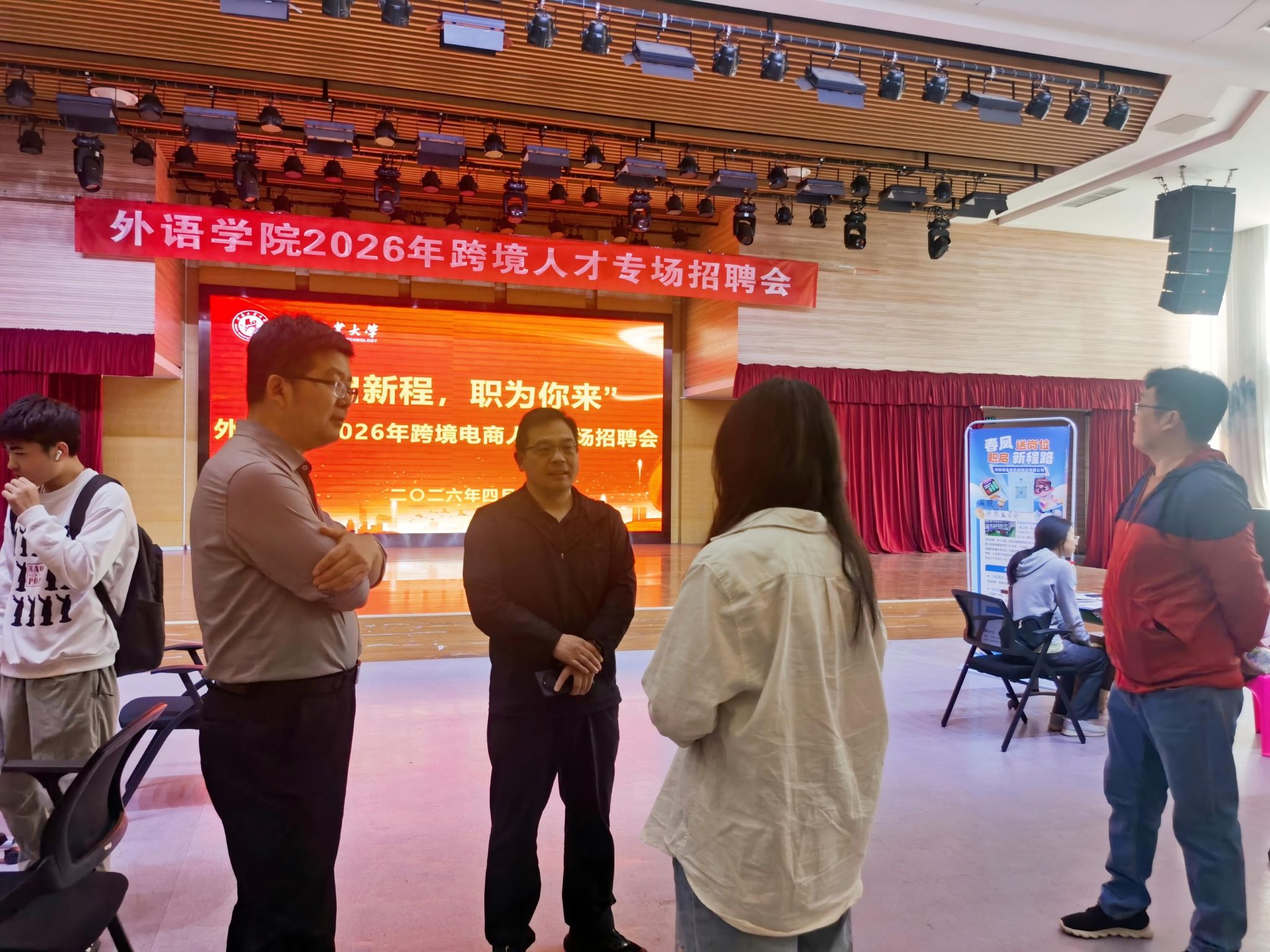 在学生事务中心报告厅举办跨境电商人才双选会。双选会依托阿里巴巴国际站平台资源,岗位方向聚焦跨境电商运营、外贸业务、国际营销等领域,共有11家优质企业参会。