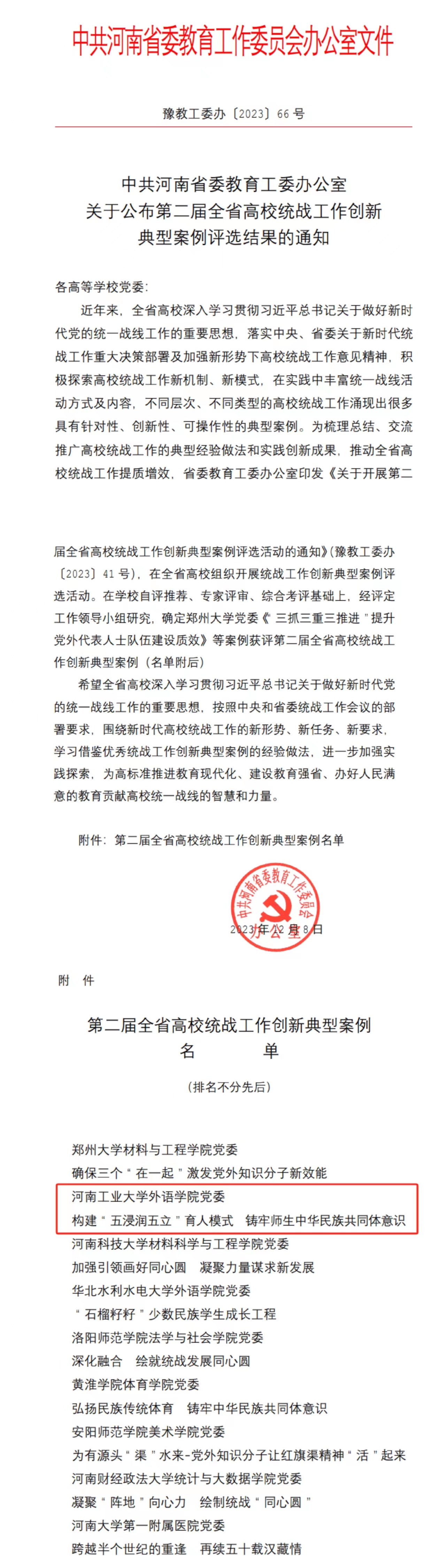 近日,中共河南省委教育工委办公室下发《关于公布第二届全省高校统战工作创新典型案例评选结果的通知》(豫教工委办〔2023〕66号),星空体育