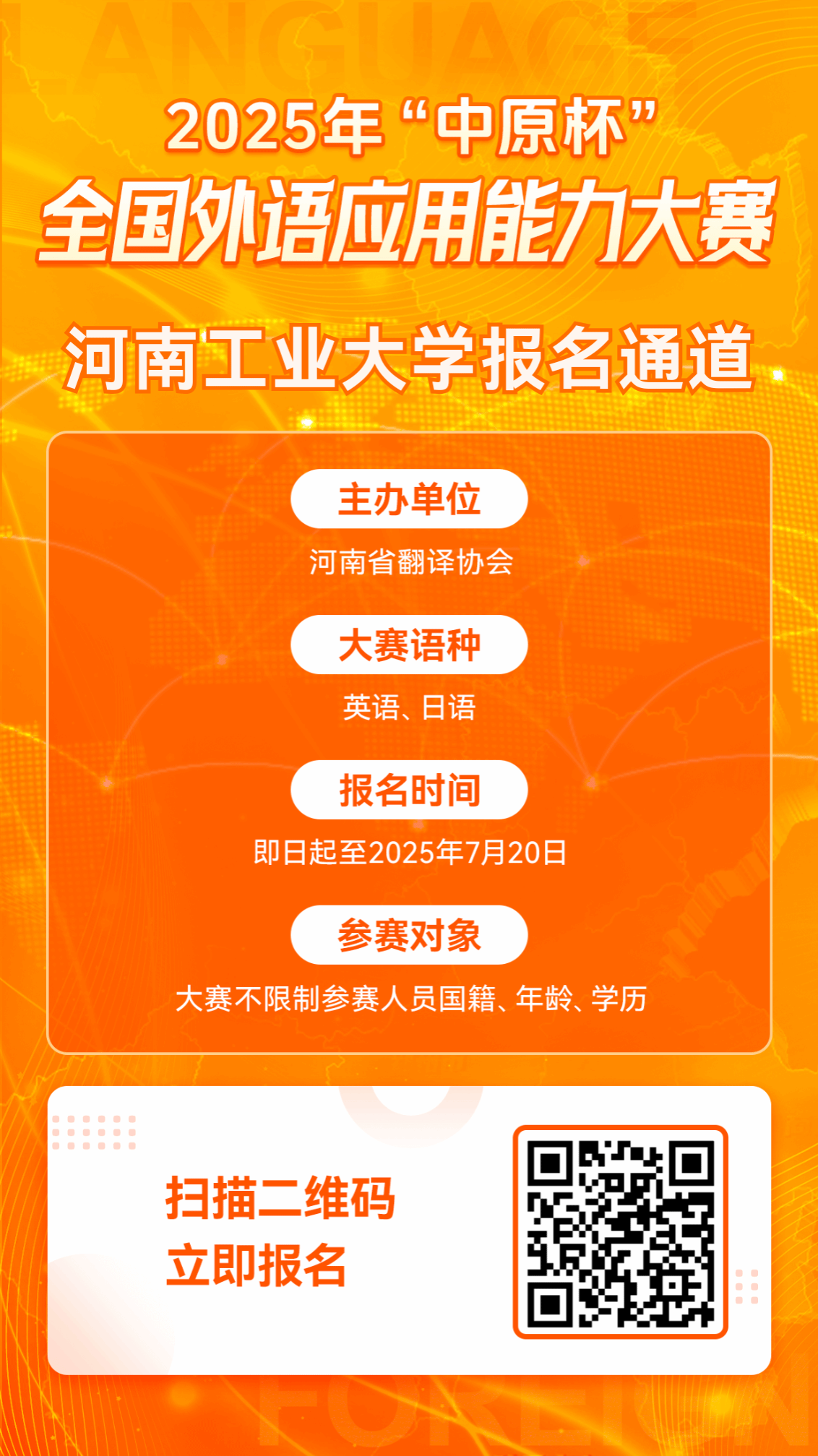为提升外语学习者的语言应用能力,培养更多高素质的外语人才,河南省翻译协会特举办2025年“中原杯”全国外语应用能力大赛。