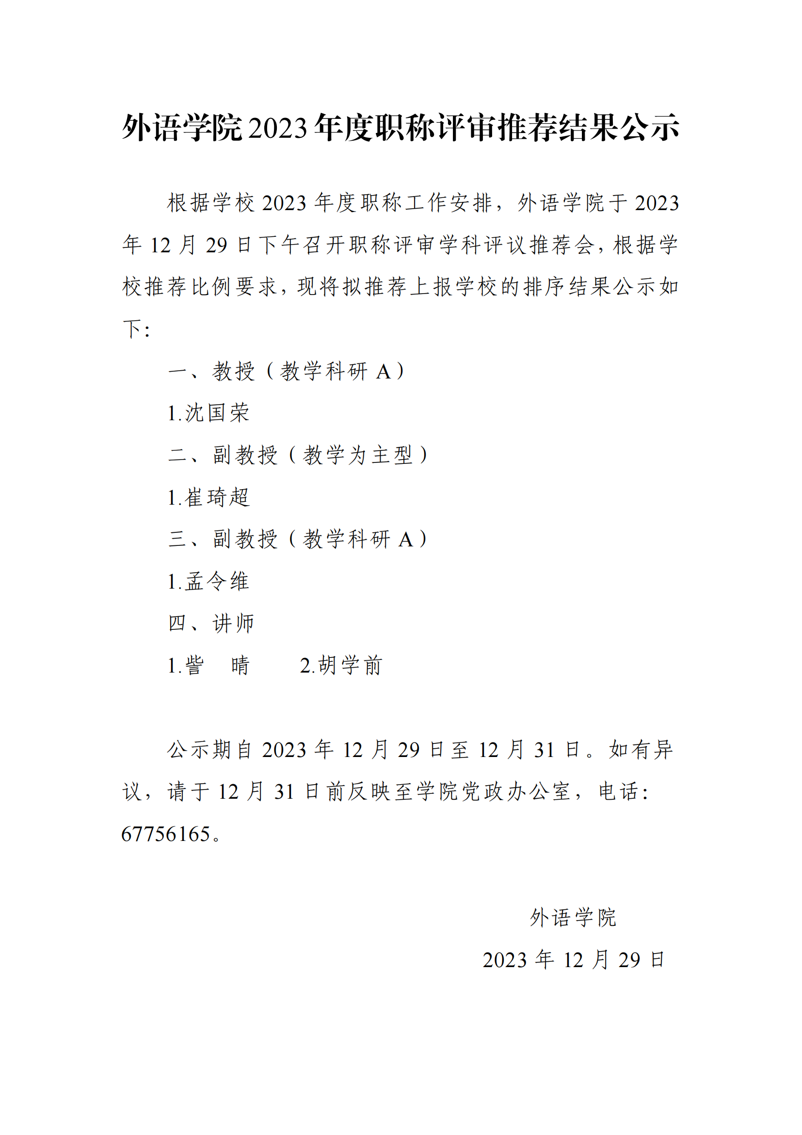 星空体育 2023年度职称评审推荐结果公示