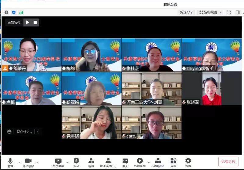 2022届硕士研究生学位论文答辩在线上圆满完成。答辩共分翻译学、语言学、文学三个组,分别邀请河南大学刘泽权教授河南大学、广东外语外贸大学卢植教授、河南大学张璟慧教授担任评审专家组组长。评审专家组成员包括中山大学王东风教授、中国海洋大学任东升教授等15名校内外专家学者组成。星空体育