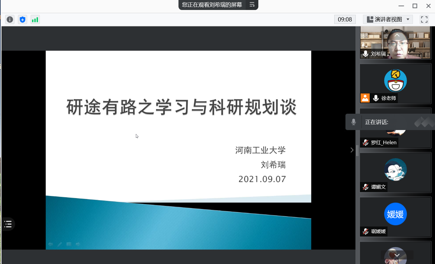 院长助理刘希瑞以“研途有路之学习与科研规划谈”为题,从观念转变、专业知识学习、批判性读书、写作要求、学风文风建设、科研与工作考博七个方面畅谈研究生学习期间规划。他提出,研究生区别于本科学习,需要转变观念,包括从学习语言到学习知识转变、被动学习到自主学习转变等。此外,他还强调,研究生期间需要刻苦学习,遵守学术道德,同时劳逸结合,注重全面发展。
