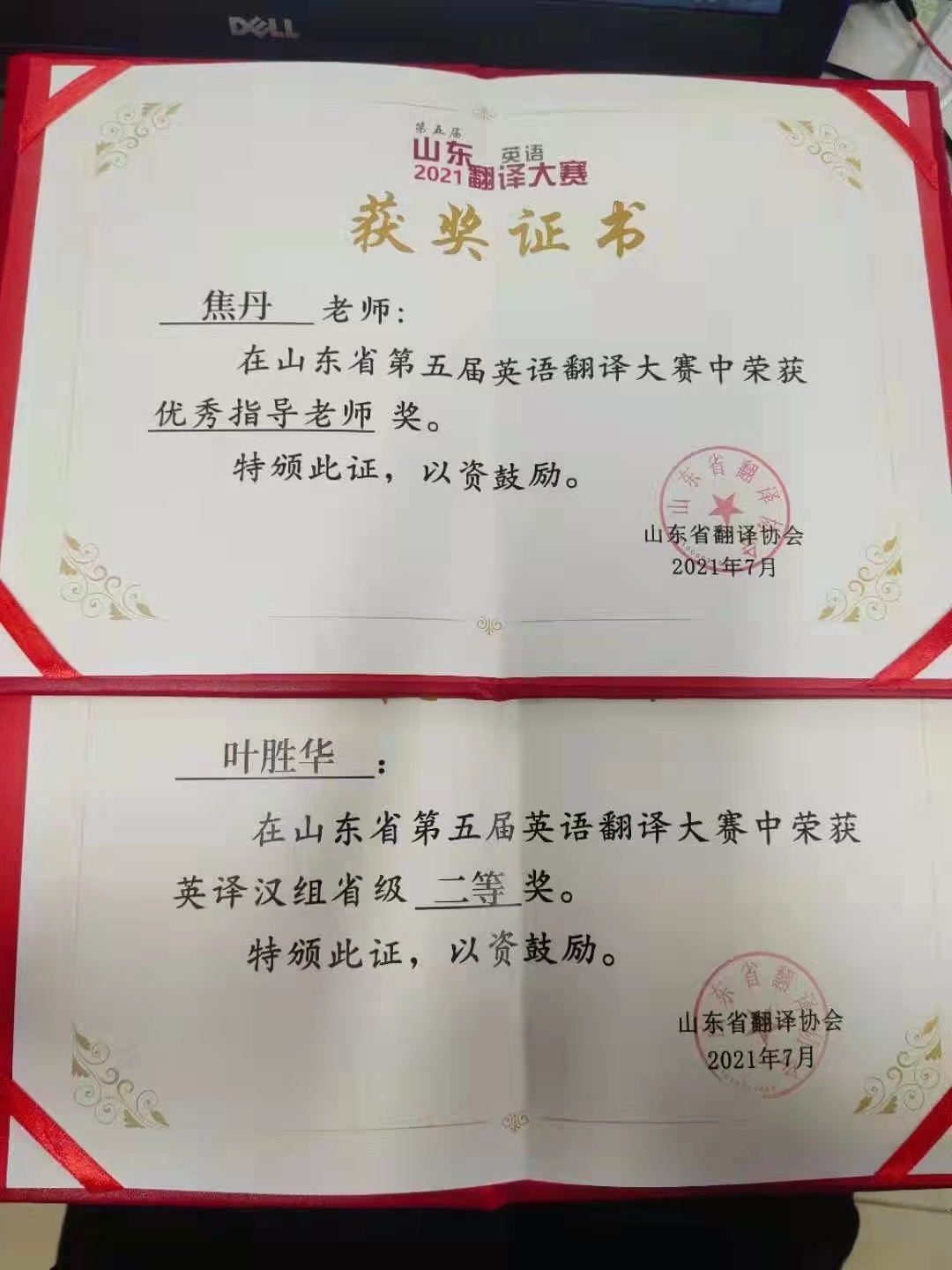 2020级研究生叶胜华同学在山东省第五届英语翻译大赛中荣获翻译英译汉组省级二等奖,焦丹老师获得优秀指导老师称号。